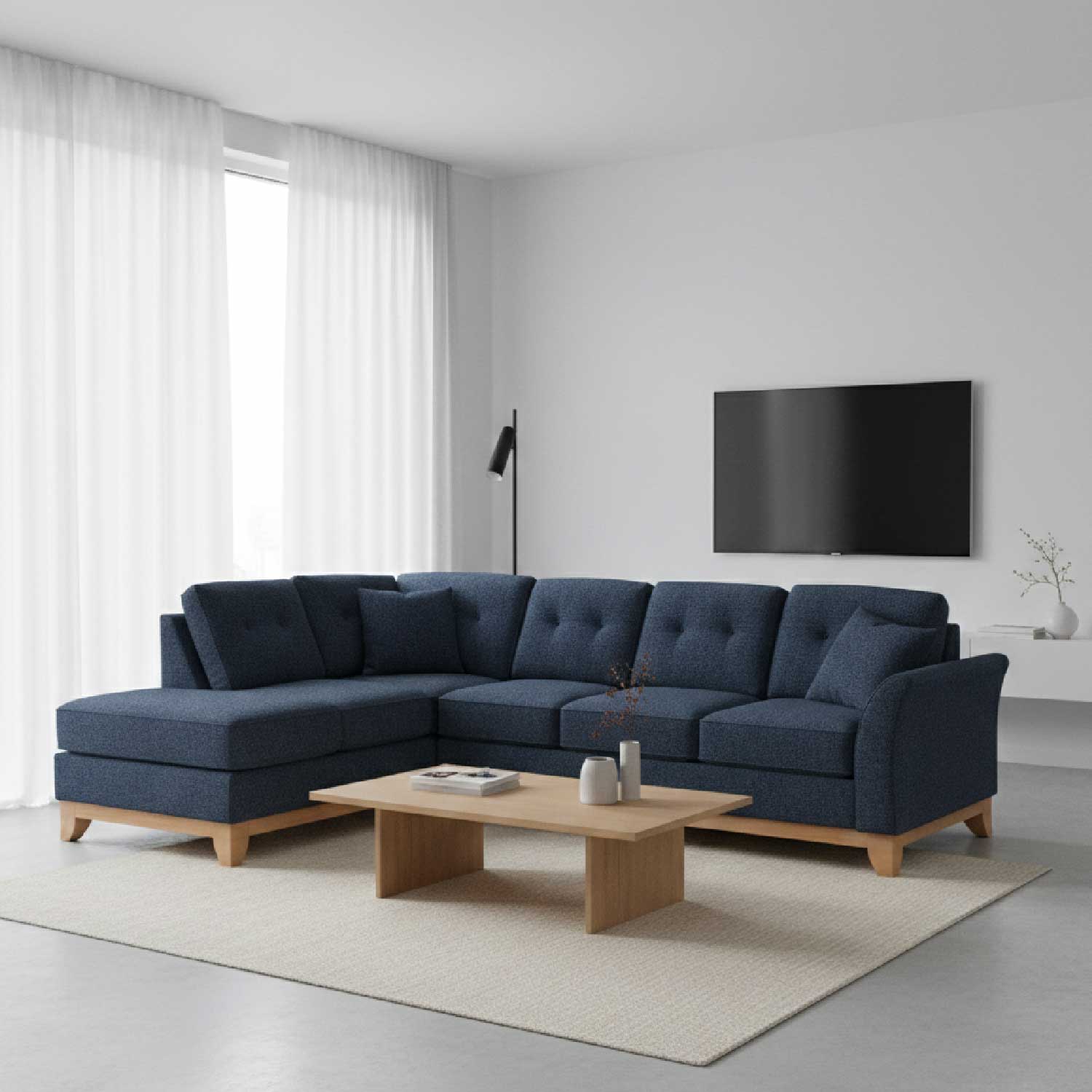 The Laguna 2 piece Sectional is the embodiment of coastal elegance and relaxation. Its design blends clean lines with a laid-back charm, making it a perfect addition to beachfront homes or anyone seeking a touch of seaside tranquility. The chaise section extends generously, offering ample space to unwind and enjoy lazy afternoons. Upholstered in soft fabrics and featuring light wood accents or coastal hues, the Laguna sectional brings a refreshing coastal vibe to any living space. With its plush cushions and sturdy construction, it ensures both comfort and durability, making it an inviting centerpiece for casual gatherings.